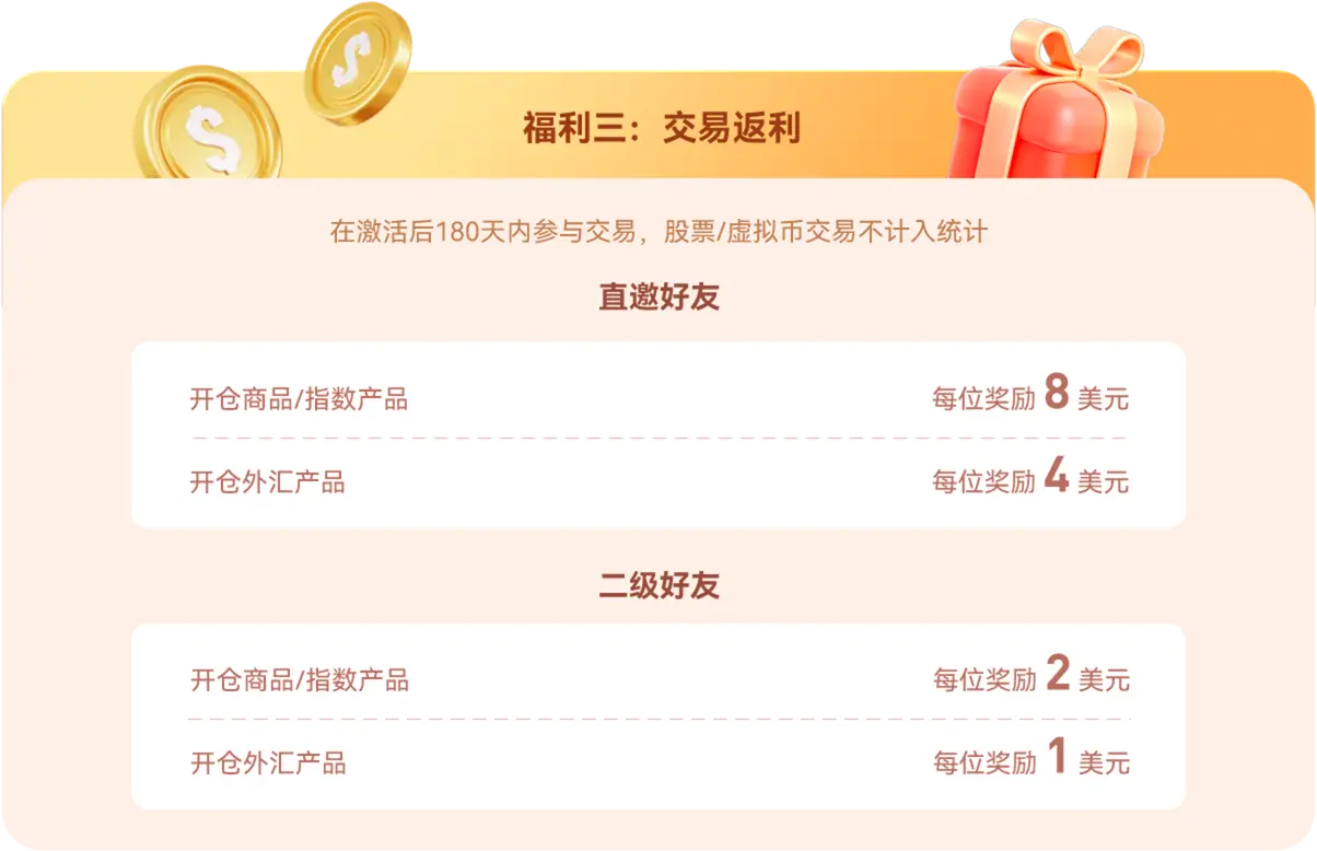 (4)交易奖励统计好友在激活后180天内的累计交易手数(股票/虚拟币除外),直接邀请好友每交易1手,您可以领取对应返利,最高1000美元。间接邀请好友在激活后180天内每完成1手有效交易(股票/虚拟币除外),您也可以领取2美元/手返利,最高1000美元。(不满1手将按照比例发放)