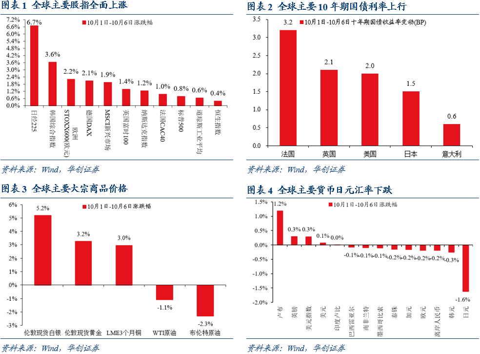 1、股市:全球主要股指全面上涨,日股、韩股、欧股涨幅领先。10月1日~6日,日经225、韩国综合指数、欧洲斯托克600指数、德国DAX、MSCI新兴市场指数、富时100、纳斯达克、法国CAC40、标普500、道琼斯和恒生指数分别上涨6.7%、3.6%、2.2%、2.1%、1.9%、1.4%、1.2%、1.0%、 0.8%、0.6%和0.4%。