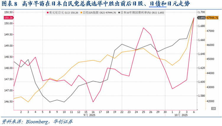 资本市场如何反应?市场普遍押注日本将采取大规模财政刺激措施、宽松的货币政策、日元走弱以及收益率曲线趋陡,因此在高市早苗胜选后日本股市飙升至历史新高。与此同时,日元兑美元大幅走弱,截至2025年10月6日已经跌破150关口。此外,根据彭博社消息,随着高市早苗几乎肯定会当选日本首相,加息步伐可能放缓,做空日元的货币交易似乎将卷土重来。
