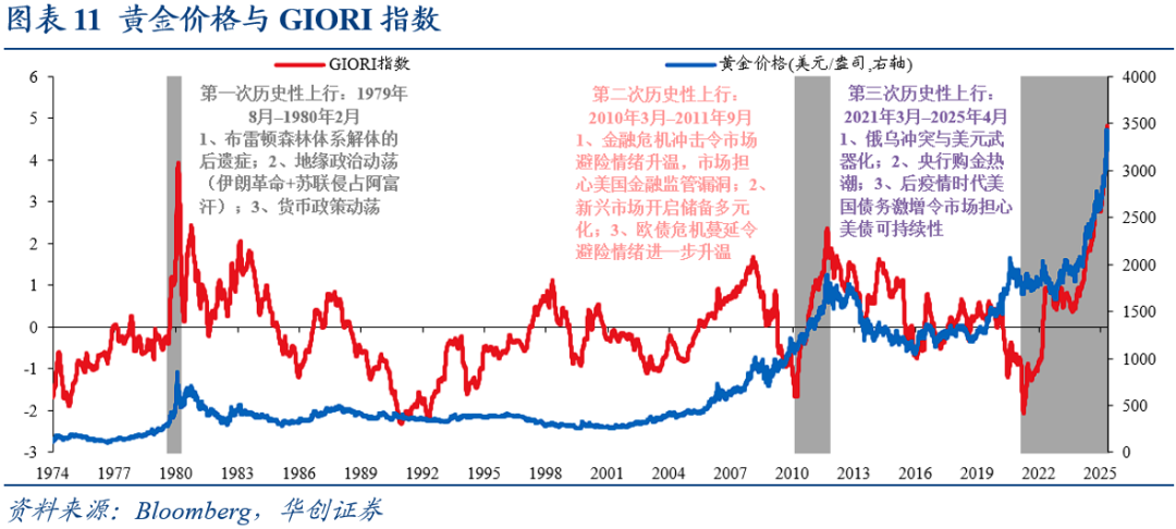 过去两次百年秩序重构期,1800年前后、1930年前后,都出现了10年左右的黄金激烈脉冲(3-5倍),一旦秩序明朗后,新秩序、新主导、新法币或许会站上黄金的肩膀走向历史舞台的核心。基于我们构建的新工具——黄金隐含“秩序重构”指数,也就是剥离黄金价格可以被常规因素(美元指数、实际利率等)解释的因素后的“不可解释”部分,可以看到GIORI已接近(略有超越)布雷顿森林体系瓦解的70年代峰值。当下秩序重构加剧的背景下,建议关注黄金的历史性机会。