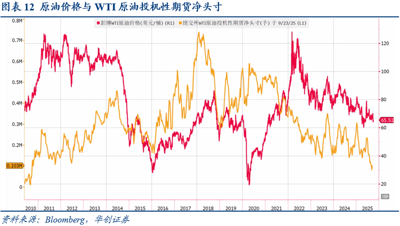 这一增产幅度远低于此前市场预期,反映的是沙特和俄罗斯两大核心产油国妥协的结果。俄罗斯倾向于限制供应以支撑油价,而沙特则更关注市场份额和增加收入,支持更大规模的增产。OPEC+坚定的持续增产方向,叠加全球经济前景的疲软和季节性需求下滑,使得市场普遍预计未来几个月全球供应将面临过剩风险。此外,WTI原油投机性期货净头寸已经跌至2010年以来的历史低位,反映了市场对原油价格走弱的预期。