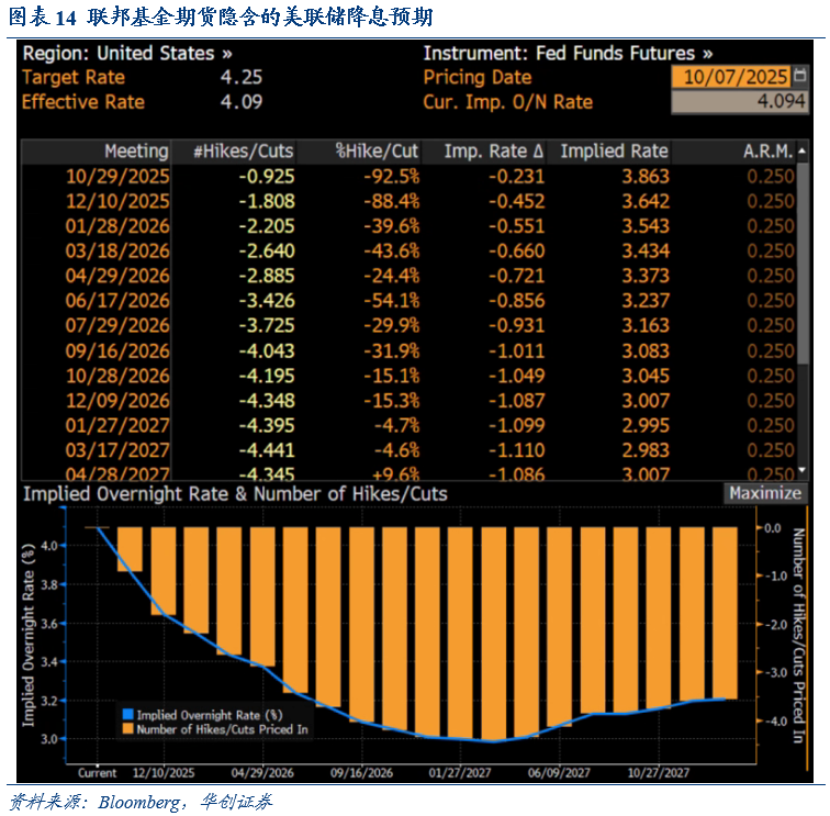 10月3日,美联储副主席杰斐逊发表讲话,称美联储正同时面对就业市场走软和通胀高于目标这两大挑战。达拉斯联储主席洛根则表示,通胀问题的严重性高于就业,呼吁谨慎对待进一步降息。而美联储理事米兰则称希望美联储在下次FOMC会议前能获得所需数据。美联储政策应具有前瞻性;住房成本是思考中的关键因素,预计住房价格将显著抑制服务业通胀。截至10月7日,市场普遍预期10月份还有一次降息,联邦基金期货隐含的美联储10月份降息的概率为92.5%。