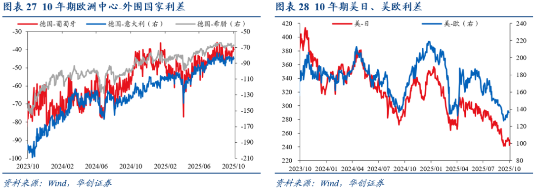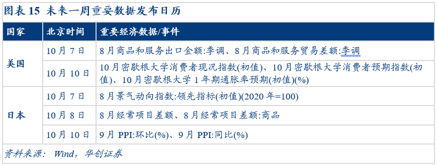 美欧、美日国债利差收窄。9月29日,10年期美欧国债利差为136bp,较一周前收窄2bp。10月3日,美日利差为246bp,较一周前收窄7bp。