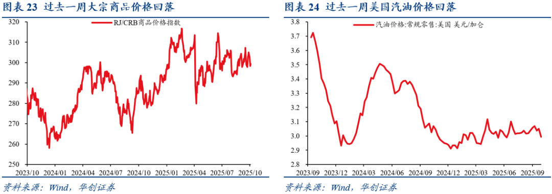 大宗商品价格回落。10月3日,RJ/CRB商品价格指数录得299.4,较一周前-1.9%,较两周前+0.1%。