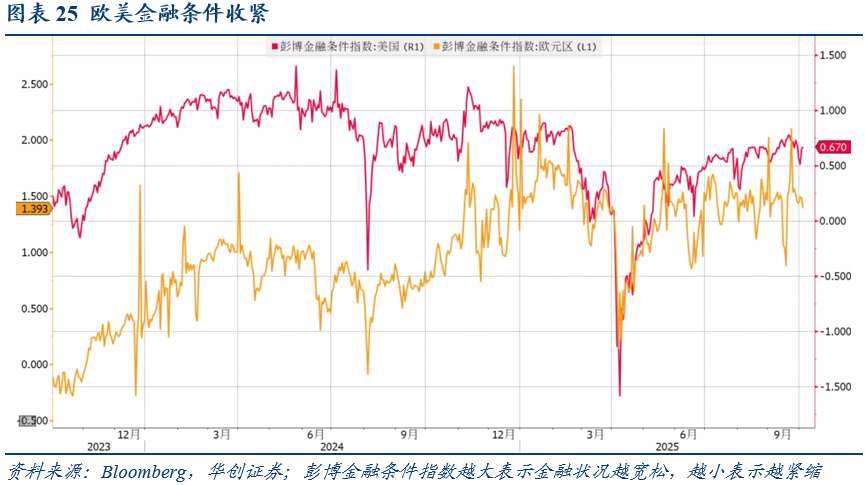 欧美金融条件指数下行。10月3日,美国、欧元区金融条件指数分别为0.67、1.39,一周前分别为0.73、1.52,两周前分别为0.78、1.54。