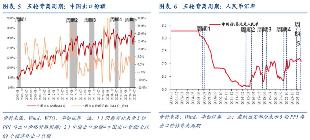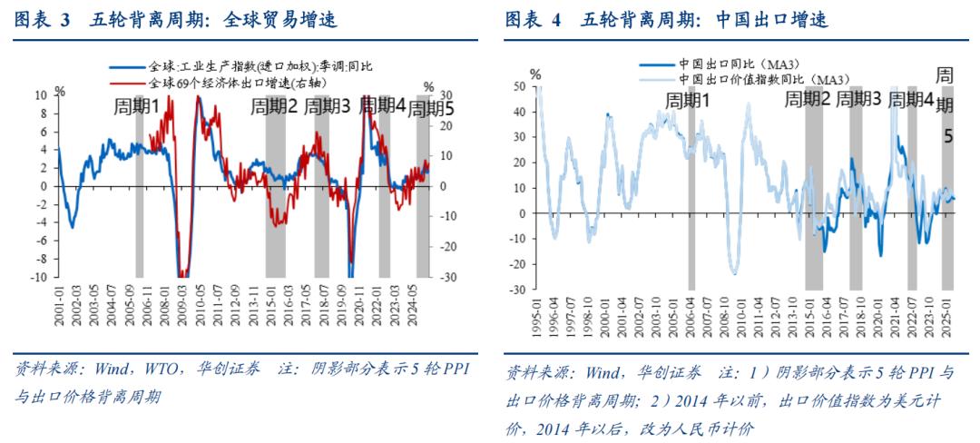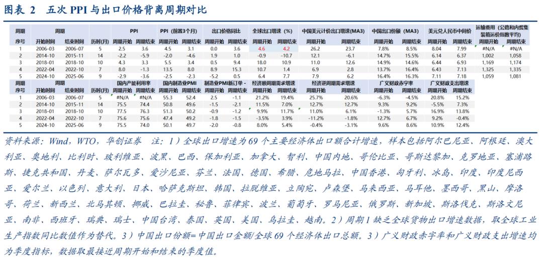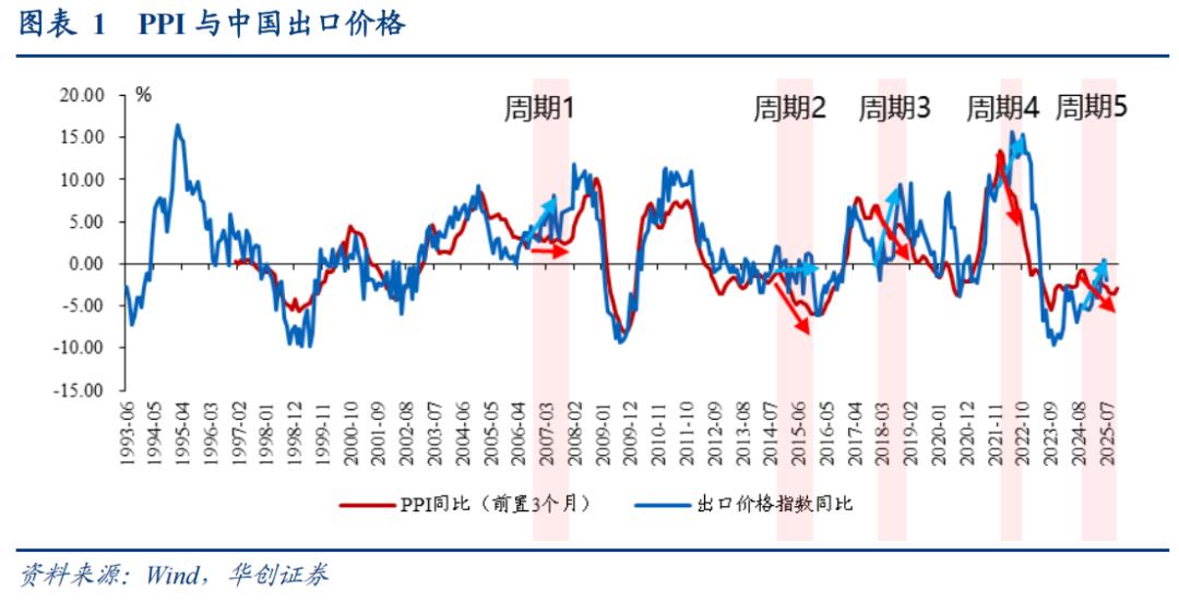 首先,寻找PPI与中国出口价格背离周期。有数据以来,共有五次较为明显的出口价格增速上行、而PPI下行的背离。分别为:1)周期1:2006年3月-2006年7月,2)周期2:2014年10月-2015年11月;3)周期3:2018年1月-2018年10月;4)周期4:2022年4月-2022年10月;5)周期5:2024年10月-至今(本轮)。