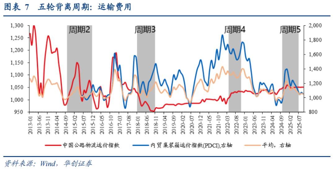 结论:从汇率看,周期1与另外3轮周期存在明显区别。周期2-4中,人民币对美元出现较大幅度贬值,而周期1中,人民币汇率较为稳定、小幅升值,当然这与汇率机制也有关系(图6)。从流通费用看,不存在明显的特征。周期2-3中,我国境内运输费用(用公路运价指数和内贸集装箱运价指数均值衡量)低位震荡;周期4中,运输费用高位震荡(图7)。