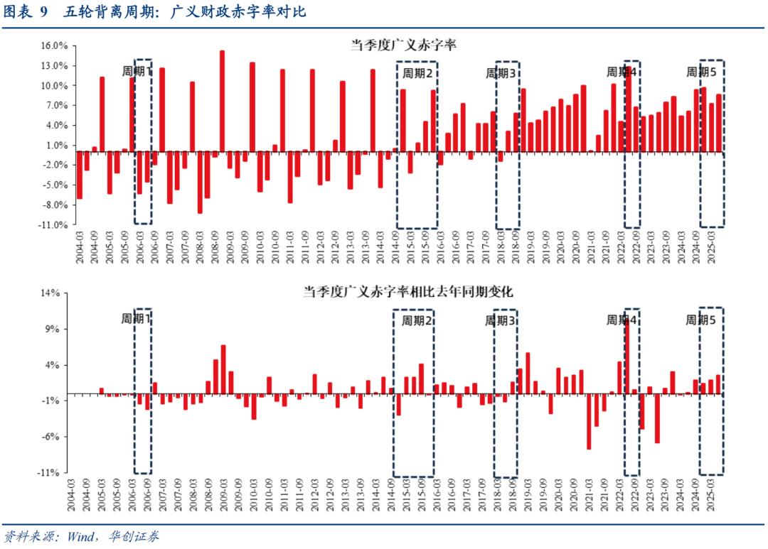 结论:1)从广义财政赤字率来看,周期1相比于周期2-4并不存在明显区别特征。2)考虑到赤字率季节性特征明显,波动较大,我们单独考察广义财政支出同比增速,周期1与周期2-4相比一大区别是,财政支出增速水平明显高于周期2-4。