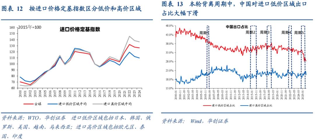 从中国出口角度看,本轮背离周期中,中国对进口低价区域的出口占比大幅下滑(主要是因为对美国出口大幅下滑),由2024年10月34.3%降至2025年6月30.2%,回落约4.1个百分点,而过往四轮背离周期平均仅回落约0.8个百分点;对进口高价区域的出口占比抬升,由2024年10月19.6%升至2025年6月21.3%,回升1.7个点,过往四轮周期平均变化-0.5%。