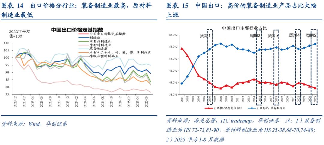 分行业来看,本轮背离周期中,中国出口高价商品占比大幅提升、低价商品占比回落。中国出口主要行业中,装备制造业商品出口价格最高,原材料制造业商品出口价格最低(图14)。今年以来,中国出口装备制造业商品占比升至2001年以来次高(2025年1-8月占比为59.2%),仅略低于2008年占比59.3%(图15)。