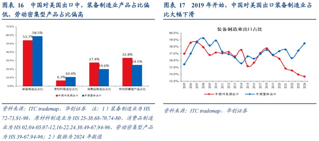 1)高关税压力下,今年中国对美国出口占比大幅下滑,而中国对美出口中,高价的装备制造业占比相对偏低、低价的劳动密集型产品占比相对偏高(图16)。2024年,中国对美国出口中,装备制造业产品占比53.7%,低于中国整体出口中装备制造业占比58.5%;中国对美国出口中,劳动密集型产品占比32.8%,中国整体出口中占比则为24.5%。