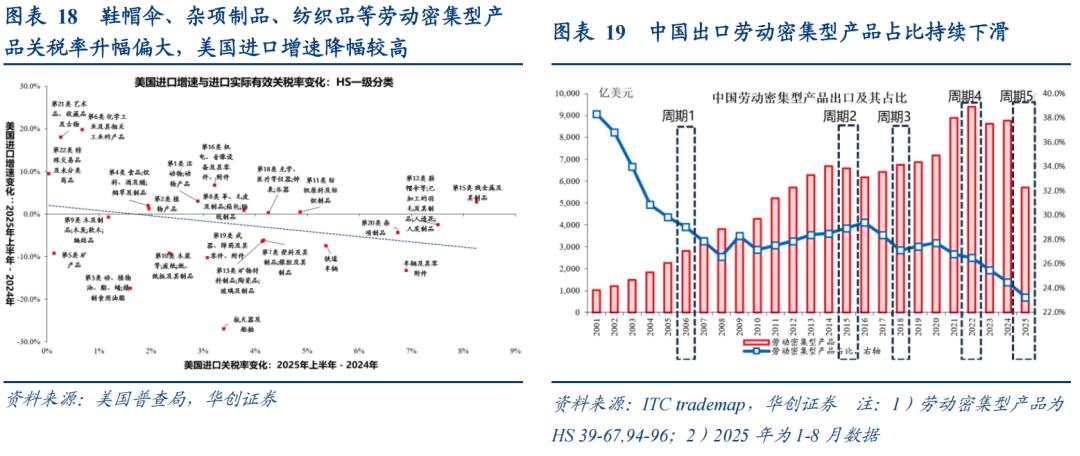 1)美国劳密产品进口关税率提升幅度相对较大,带来美国劳密产品进口整体回落幅度较大。如,2024年-2025年上半年,鞋帽伞关税率由11.4%升至19.0%,进口增速由5.1%降至2.5%;杂项制品关税率由4%升至10.8%,进口增速由2.7%降至-1.8%(图18)。