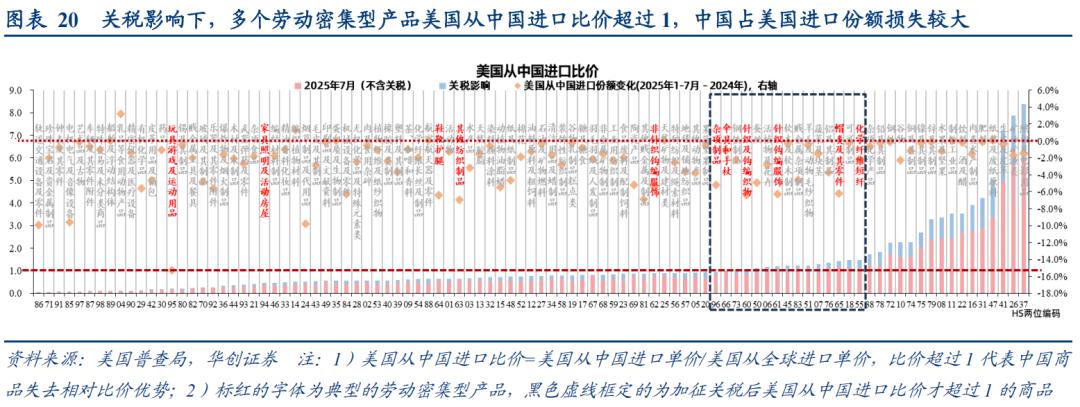 2)劳密产品的性质决定其竞争力较为依赖价格优势,关税导致美国从中国进口的多项劳密产品的比价(从中国进口单价/从全球进口单价)由原本低于1(反映中国商品具备相对价格优势)变为超过1,进而导致中国劳密产品在美国进口中所占份额下滑幅度较大(图20)。