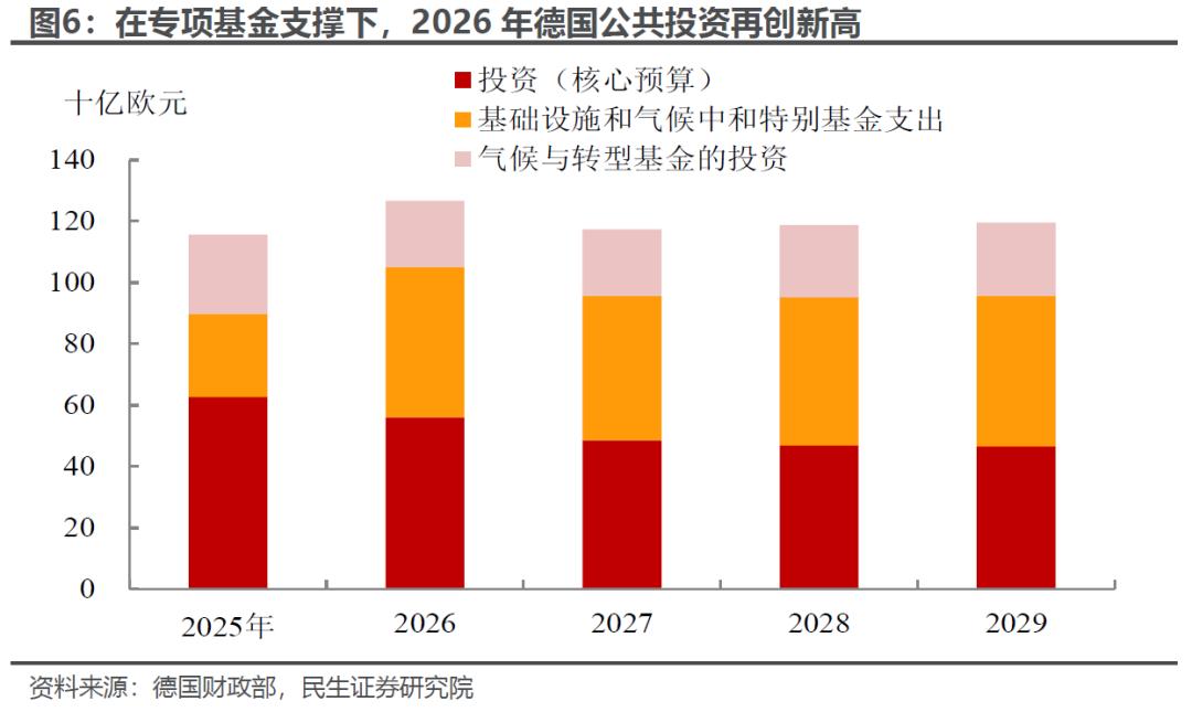 其中最引人注目的是公共投资规模创下历史新高,这一扩张得益于年初设立的5000亿欧元基础设施特别基金。2026年德国总投资额将达到1267亿欧元,较2025年、2024年分别增长近10%、70%。其中561亿欧元来自核心预算,另外的489亿欧元、217亿欧元将分别从基础设施和气候中和特别基金、气候与转型基金中拨出。