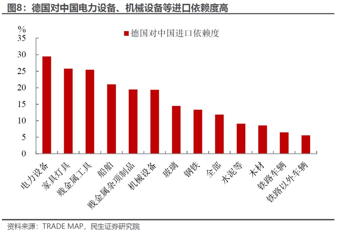 最后,值得关注的是德国财政扩张对中国出口的联动影响。尽管德国在中国出口中的占比仅约3%,其1%左右的GDP增长对中国出口总量的拉动作用或相对有限,但结构性机会仍值得挖掘。由于德国本轮投资扩张重点聚焦交通、清洁能源、国防等基建领域,覆盖机械设备、电力设备、金属等行业——德国对华进口存在较高依赖,因此中国相关行业出口也将因此直接受益。