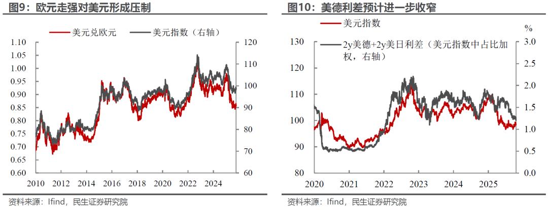 其中,在预算(扣除利息)和专项基金的推动下,德国2026年财政支出增速有望达到7%左右,但美国受制于债务利息的飙升,非利息支出增速仅为德国的一半左右(约3.4%)。虽然2024年美国GDP是德国GDP的6倍以上,但如果分母是欧元区,这个数字就下降到了1.5倍。如果欧元区其他国家可以跟上,欧洲财政的崛起或是2026年全球需求最大的变数。财政分化下,美欧经济与通胀预期差也将逐步收敛,中期美元或延续弱势格局。