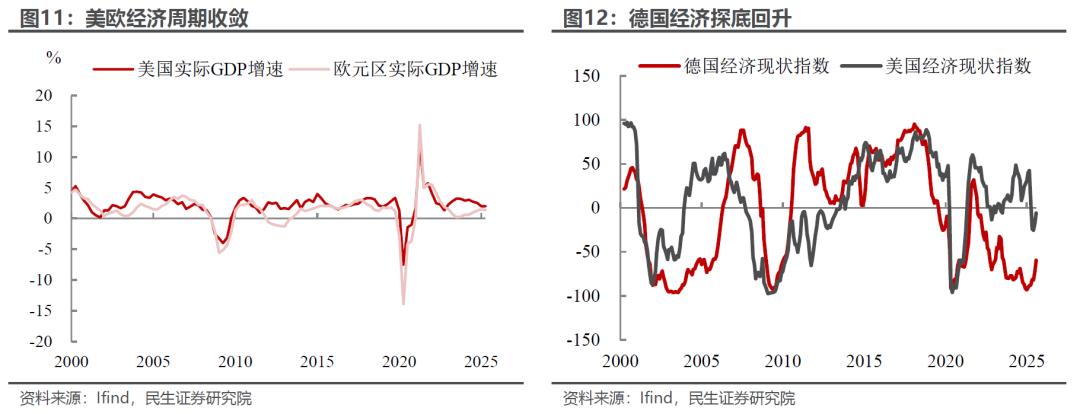 这也将进一步压制美元走势。正如我们此前报告所言,当前美欧经济与通胀周期呈现反向相位:疫情后美国经济在积极财政推动下持续扩张,如今已显“强弩之末”;而欧元区(尤其是德国)的财政政策转向及俄乌局势缓和,则构成更关键的结构性变量。