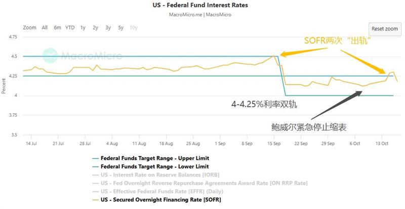 这次的情况也恰恰如此。近一个月来,SOFR数次突破利率上轨4.25%,让鲍威尔开始警觉。前天SOFR利率大幅出轨,很可能触发美联储释放流动性,将昨日SOFR利率强势压回到4.18%。不过释放流动性直接导致,在SOFR开盘时(美市盘前),美国长短债利率快速下滑,而利率敏感型资产随之大涨,其中就包括美股和黄金。