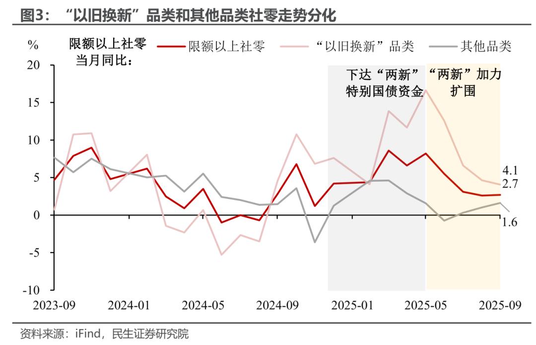 三是,在当前“以旧换新”与“反内卷”政策效应边际趋弱的背景下,内需回稳与价格回升仍需持续的政策支持作为保障。前期表现亮眼的“以旧换新”相关品类社零增速已呈连续放缓态势,部分行业也在9月再现“内卷”迹象。四季度正是考验政策延续性的关键阶段。