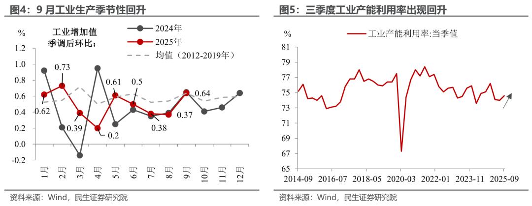 工业:生产加速并非完全是季节性的功劳,“反内卷”阶段性降温也是另一缘由。9月工业增加值同比增速上升至6.5%(8月为5.2%),环比增速上升至0.64%(8月为0.37%),均呈现出9月工业生产的加速态势。通常9月工业生产会随着极端天气的消退、节前“抢工补产”等效应而季节性加快,然而今年工业增加值环比增速胜过历史平均季节性表现,表明“反内卷”政策的降温是促使工业生产加速的另一原因。