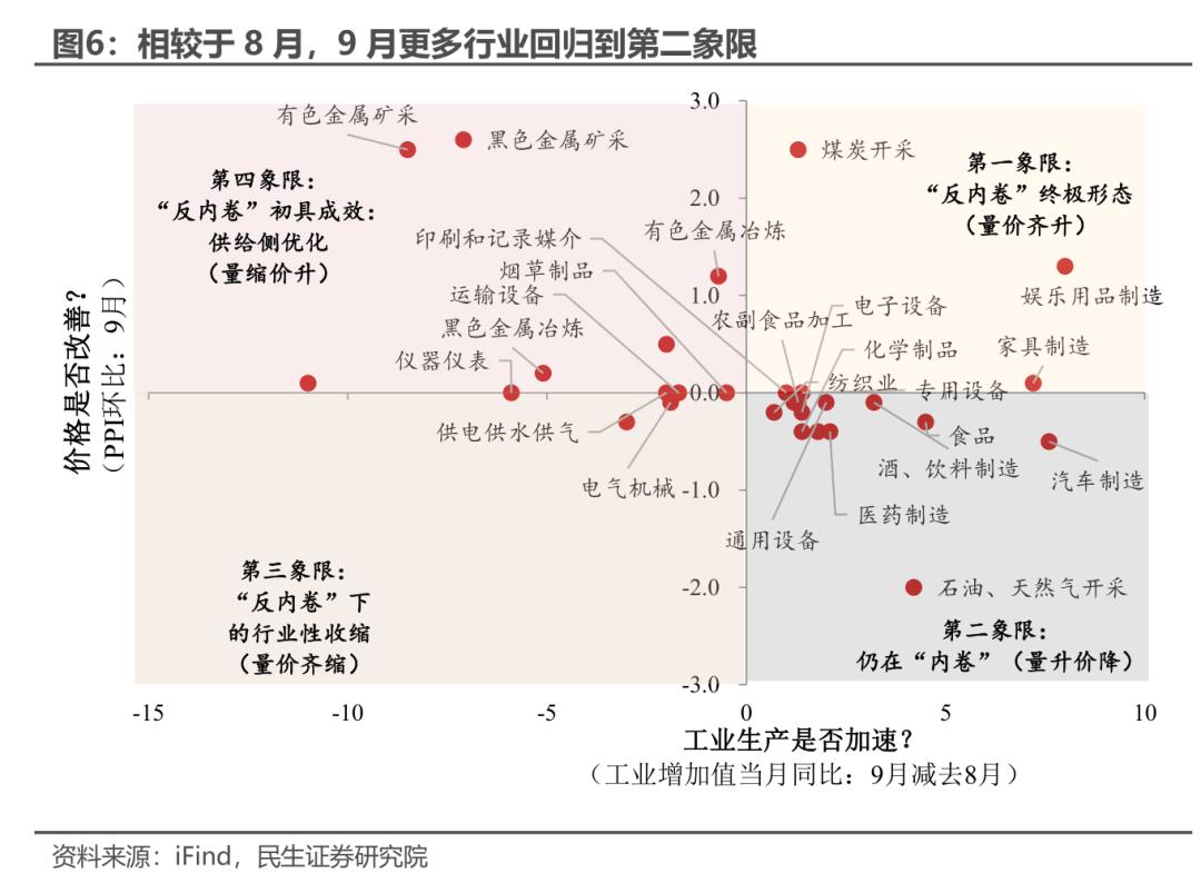 从行业量价表现,看“反内卷”降温痕迹。三季度工业产能利用率从74.0%升至74.6%、录得今年以来最高值,正是前期“反内卷”工作带来的成效。然而,根据我们此前报告提出的“反内卷”动态四象限来看,相较于上个月,9月更多行业回归到第二象限(代表“内卷”较为严重的状态),说明“反内卷”的一以贯之需要更大力度的思想凝聚,这也可能构成全会的一大看点。