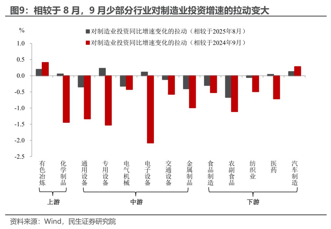 聚焦于不同行业来看,相较于8月,9月仅有少部分行业对制造业投资增速的拉动在边际变大。譬如上游的有色冶炼、化学制品,中游的专用设备、电子设备,下游的医药、汽车制造等。