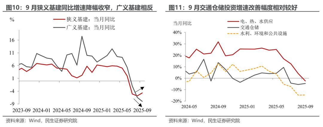 基建:“回温”信号?狭义基建同比增速从8月的-5.9%收窄至9月的-4.6%,呈现出边际回暖的信号,不过广义基建降幅仍在扩大。从基建细项数据表现来看,9月交通仓储板块的改善幅度相对明显,而公用事业板块表现逊色,这也解释了9月狭义与广义基建分化的原因。