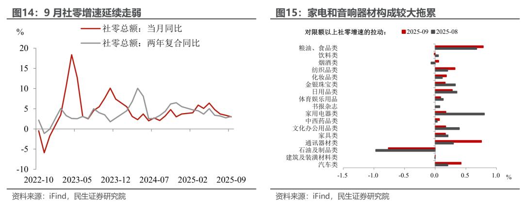 消费:家电等补贴品类叠加餐饮增速下滑,进一步拖累消费增长。9月社零增速下行至3%,连续4个月放缓,其中下半年“国补”资金力度的整体下降以及部分耐用品消费需求的前置是主要拖累。结构上,“加力扩围”产品增速延续回落,尤其是家电和音像器材形成明显拖累,但通讯设备和汽车则边际回暖。此外,9月餐饮收入增速在延续2个月的反弹后再度回落至0.9%,可能源于暑期线下消费的部分透支影响。