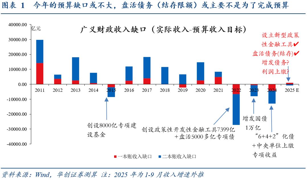 或主要不是完成财政预算目标的考量。今年的预算缺口或不大:如我们在《税收高增的非经济因素中》所述,若税收收入有韧性,则全年一本账实际收入较预算目标的缺口或不大;得益于近几个月的税收高增(本月8.7%创年内新高),若按1-9月收入增速外推全年,全年已出现预算盈余,指向本次盘活债务(结存限额)或主要不是为了完成预算。