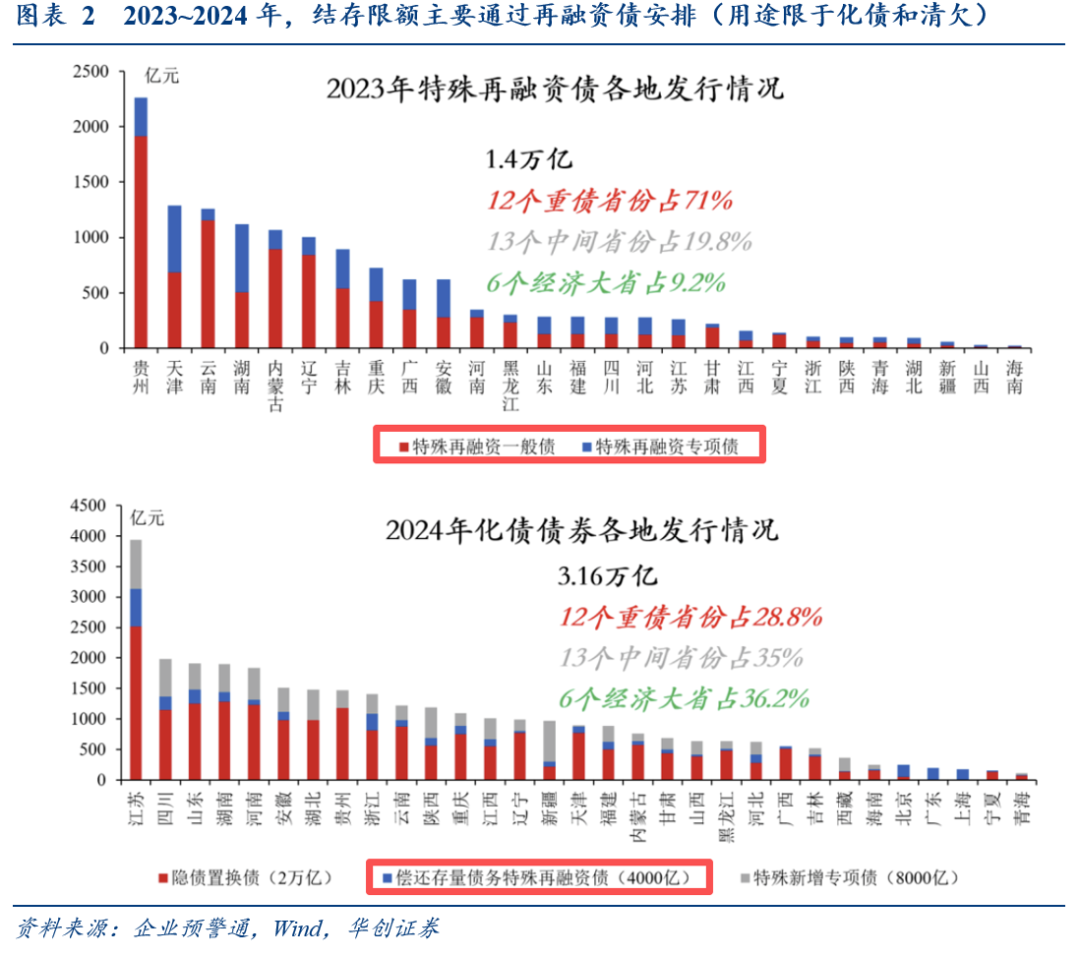 2023年以来,结存限额不用于项目建设,主要通过再融资债安排(图2):如2023年,曾发行1.4万亿特殊再融资债;2024年,在2万亿支持地方置换隐债以外,还发行了约4000亿特殊再融资债(去年10月12日的新闻发布会上,财政部介绍了安排4000亿元地方政府债务结存限额)。