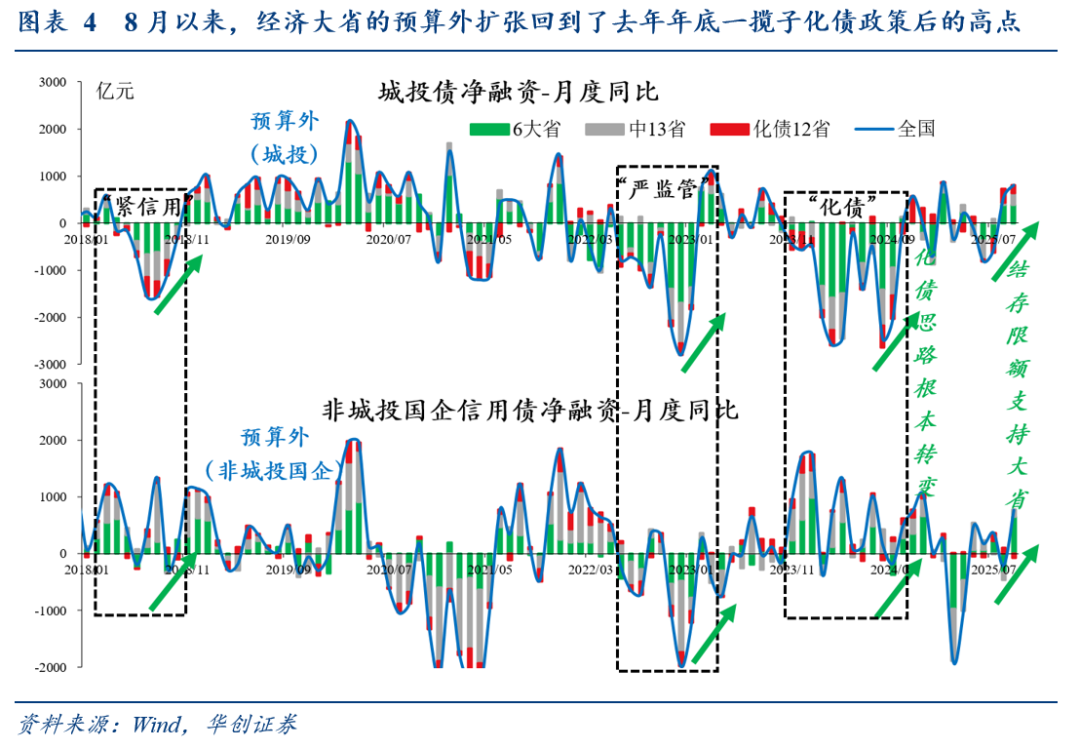 作为验证,我们观察到8月以来,地方、尤其是经济大省(6个经济大省,广东、江苏、浙江、山东、河南、四川)的预算外扩张(城投债、非城投国企信用债净融资同比多增)回到了去年年底一揽子化债政策后的高点(图4),或表明结存限额已在助力信用扩张。