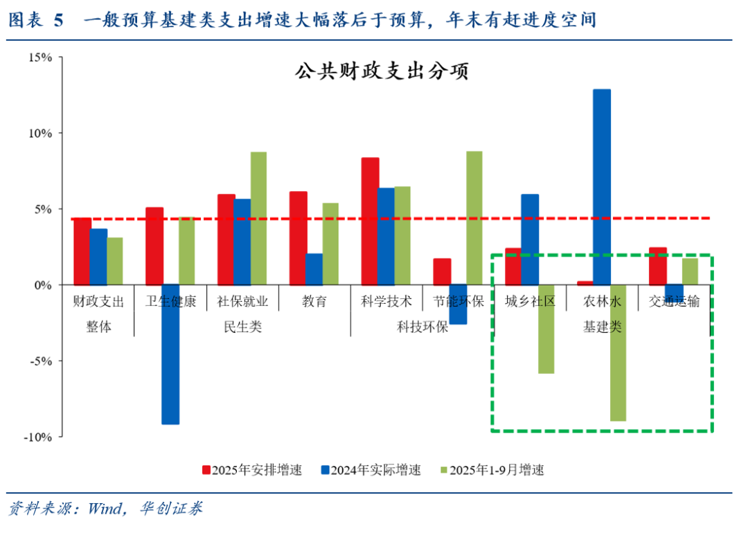 年末年初,资本金或有两大助力:一是5000亿准财政,全部用于补充资本金。据农发行,截至10月17日,已完成分配给农发行1500亿元额度的1001.11亿元基金投放;二是一般预算支出中的基建类支出(城乡社区、交通运输、农林水),前三季度增速大幅落后于预算安排(前三季度同比仅-5.6%,预算目标为1.4%),年末或配合赶进度。