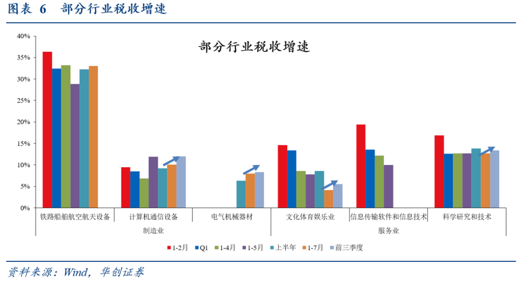 分行业看,8-9月计算机通信设备、科学研究和技术税收收入双位数增长(图6)。据财政部,(前三季度)计算机通信设备制造业税收收入增长12%,电气机械器材制造业税收收入增长8.3%;文化体育娱乐业税收收入增长5.5%;科学研究技术服务业税收收入增长13.4%。