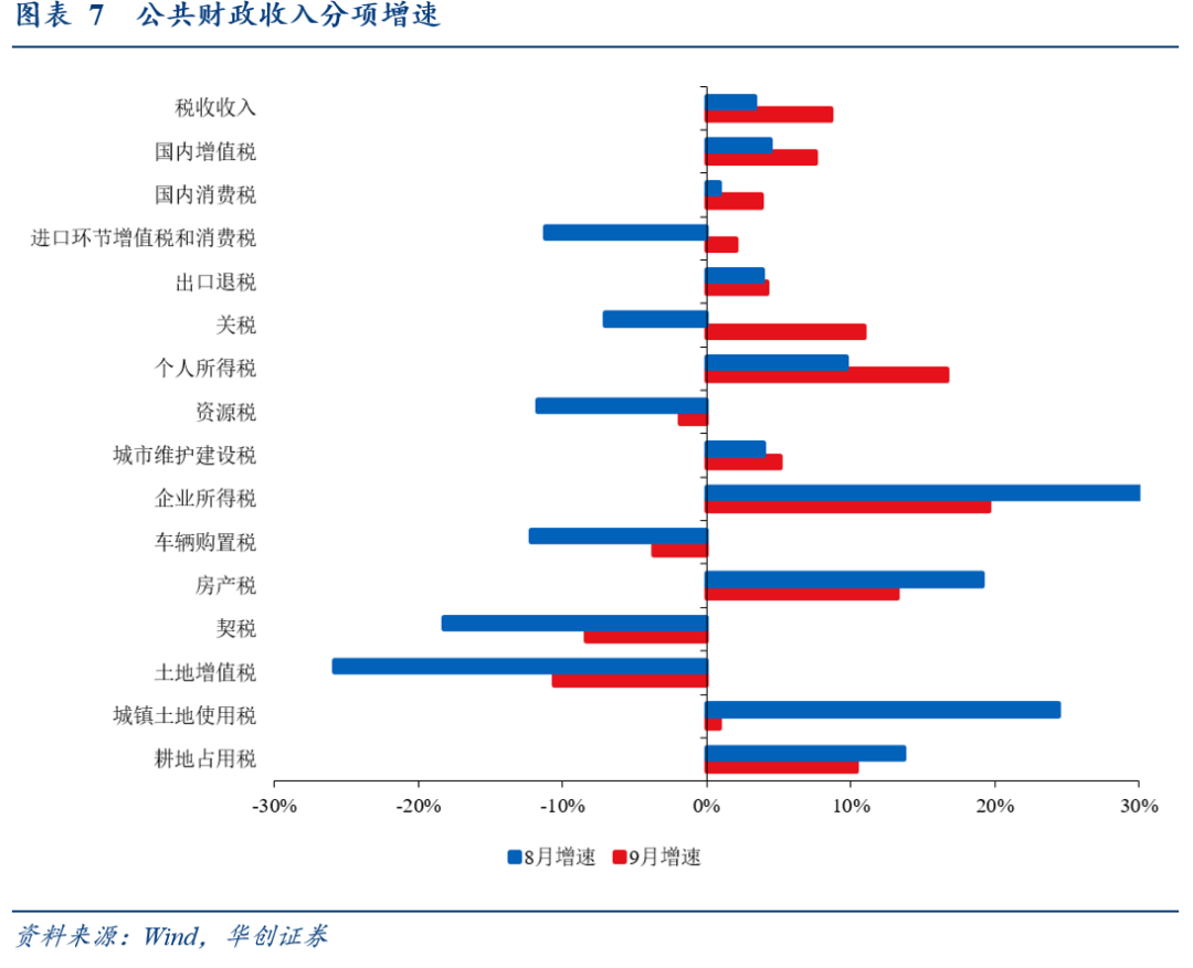 分税收收入和非税收入看,税收收入增幅创年内新高(8.7%,8月3.4%)、连续6个月正增,同时非税收入降幅扩大(-11.4%,8月-3.8%),反映地方收支压力缓释。