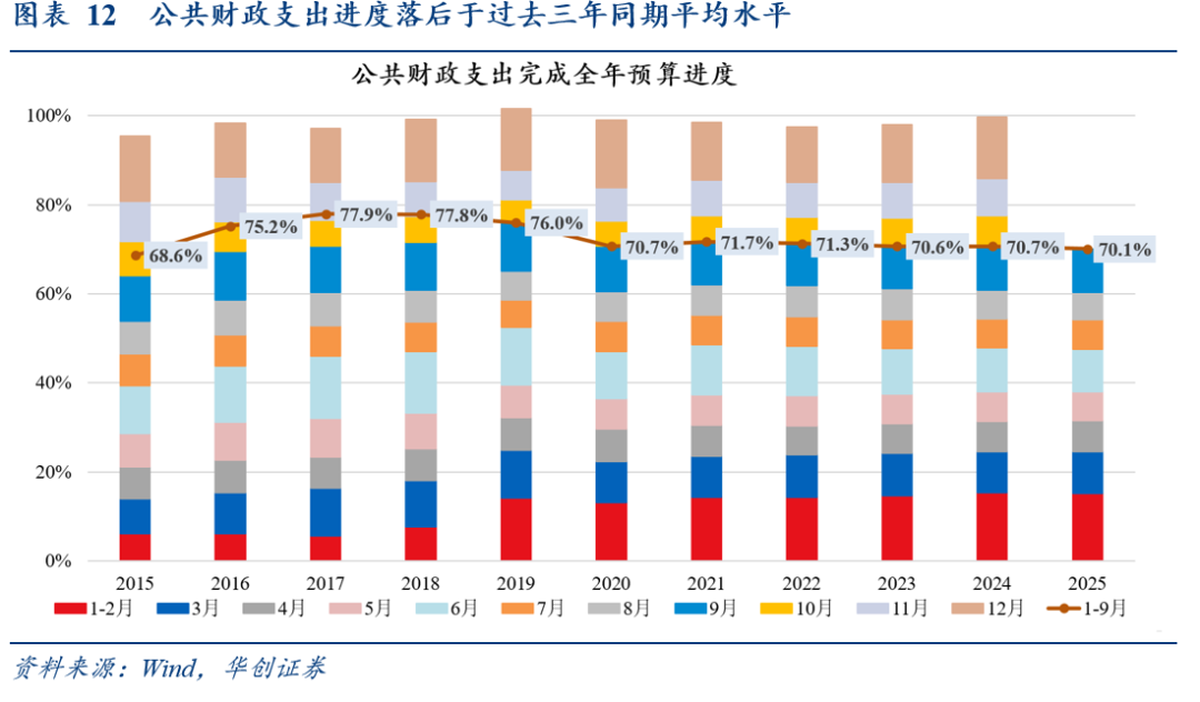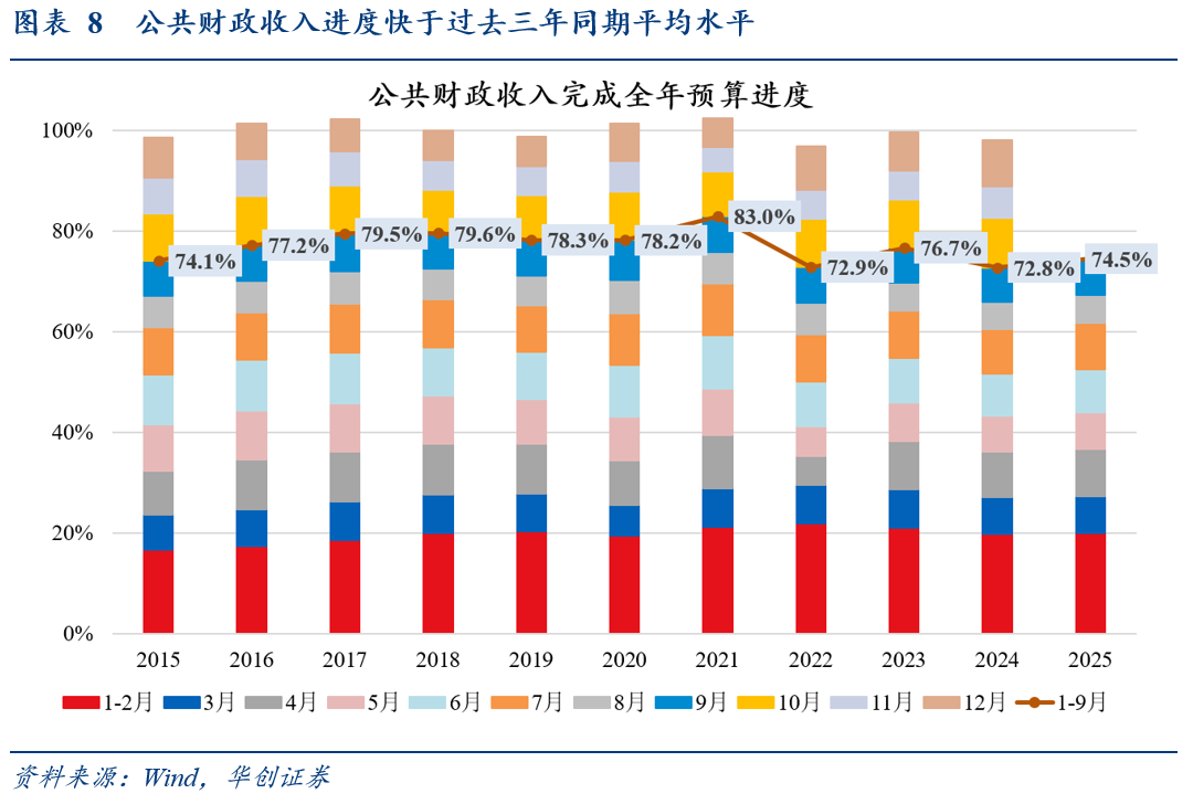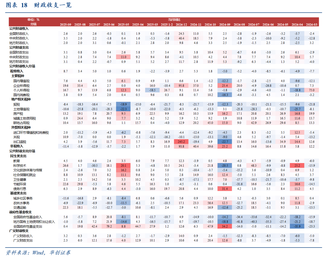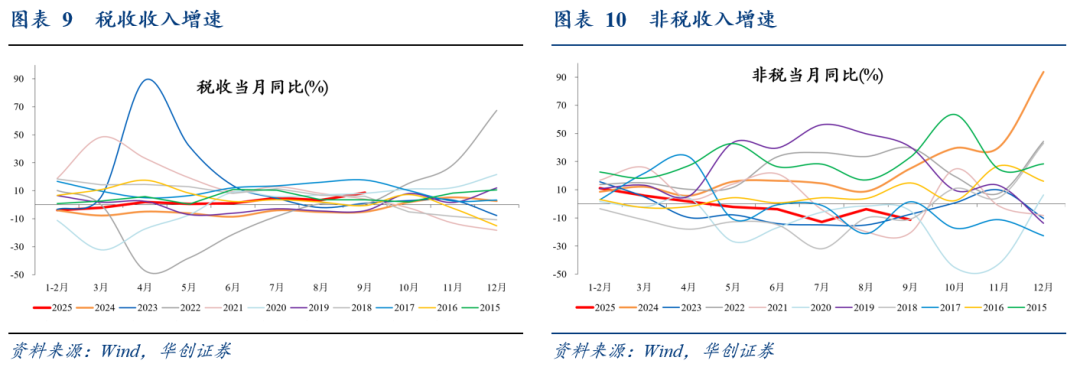 对于税收收入,从拉动结构看,与8月较为类似,主要贡献来自以国内增值税、企业所得税为代表的价格相关税(8、9月分别拉动税收收入增速4.4、5.5个百分点)和个人所得税(8、9月分别拉动税收收入增速1.1、1.7个百分点),如我们在《税收高增的非经济因素》中所述,除去年同期基数较低以外,或对应三个非经济因素正在发生变化——企业反内卷修复税收经济剪刀差、政府反内卷提升实际税率、资本市场交易活跃带动相关税收。