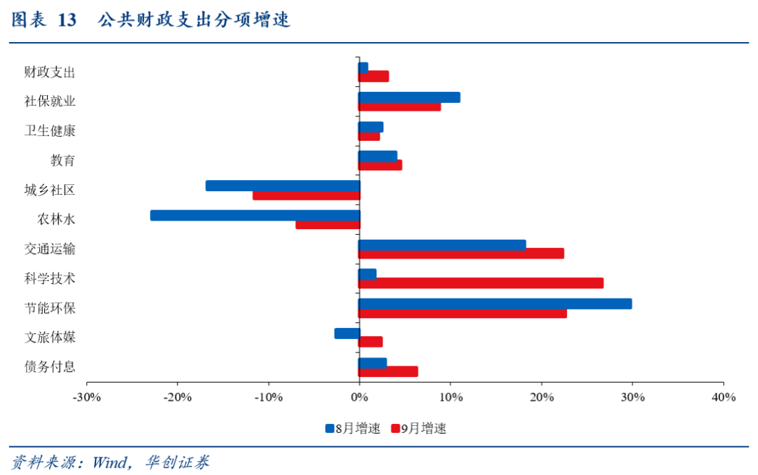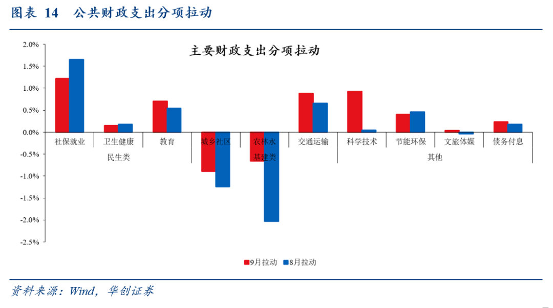 分支出类型看,基建类支出拖累明显收窄,科技支出单月贡献较大:9月三项代表性民生类支出(社保就业、卫生健康、教育)合计拉动支出增速2.1个百分点(8月拉动2.4个百分点);基建类支出(城乡社区、交通运输、农林水)合计拖累支出增速0.7个百分点(8月拖累2.6个百分点)。科技环保支出合计拉动支出增速1.3个百分点(8月拉动0.5个百分点)。持续关注四季度配合准财政发力背景下,财政会否边际转向基建类支出。