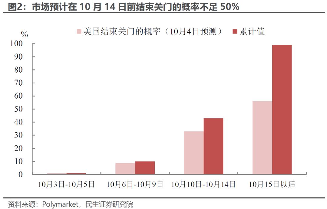 这场政府关门的闹剧最终将如何收场?参考历史,政府停摆时长通常在两周内。但Polymarket最新预测显示(10月4日),10月14日前结束停摆的概率已不足50%,而此前这一比重近70%,随着两党持续展现强硬姿态,市场对停摆大幅延长的担忧正与日俱增。