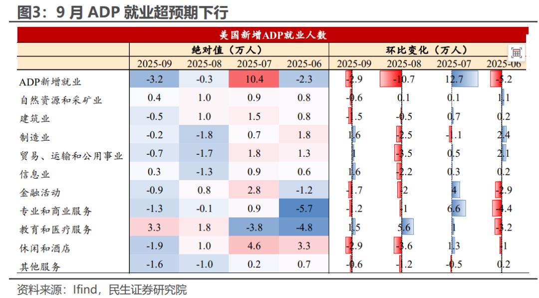 最现形的影响是对联储降息的扰动,政府关门使得私营数据的重要性明显上升,9月ADP就业已经打响了“第一枪”:尽管其对非农的指示作用有所下降,且9月报告存在技术因素。但作为美联储可能参考的唯一就业数据,ADP的超预期走弱推动市场几乎完全定价年内两次降息的可能。但需要注意的是一旦政府“关门”结束,非农数据将立即公布,我们在之前的报告中提示过从季节性上来说,8-9月新增非农就业存在上修风险。