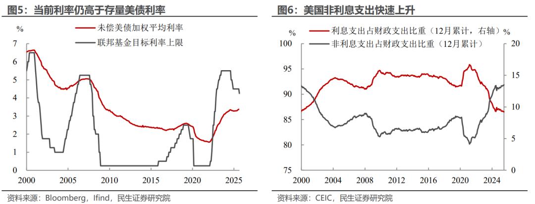 此外,尽管最高法拒绝立即罢免库克,但白宫和美联储的博弈大戏还远未结束。我们在此前的报告中提出,美国债务问题和付息压力的加剧,正蚕食美国经济增长的空间。当前美国存量债务利率维持在3.4%左右,仍远低于美联储的政策利率区间,因此小幅降息无法解决债务的根本问题,至少要100-150bp,这也是特朗普政府一直以来的诉求。