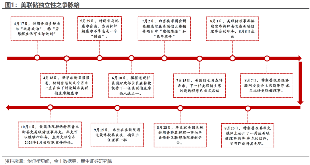 综上,明年1月库克案审理与2月底地区联储主席任免是市场需重点关注的两大节点。但对特朗普而言,干预美联储独立性的过程注定不会一帆风顺,尤其是对联储理事的起诉,这涉及到美国三权分立的制度根基,司法审判环节可能面临多重阻碍;而过度的降息也会引发通胀快速上行的担忧,市场担忧情绪将形成外部约束,不排除联储主席和理事上任后坚守独立性的可能,毕竟美联储理事的任期要比特朗普要长得多,要走的路还更远。