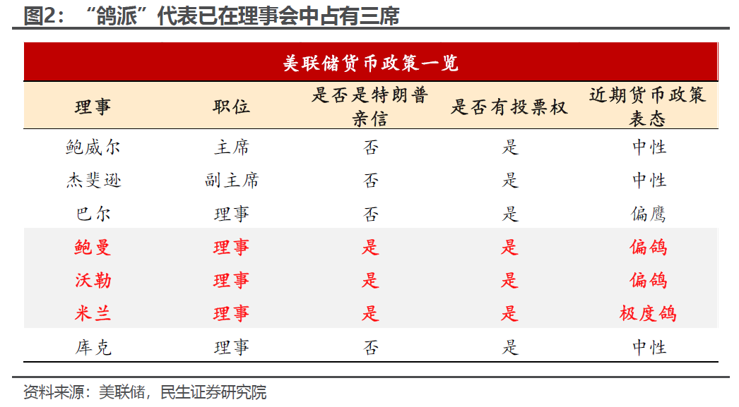 最后,明年2月底地区联储行长将迎来集中换届,我们估计特朗普将借助理事会中的己方势力干预部分行长任命,推动更多鸽派成员进入决策层。
