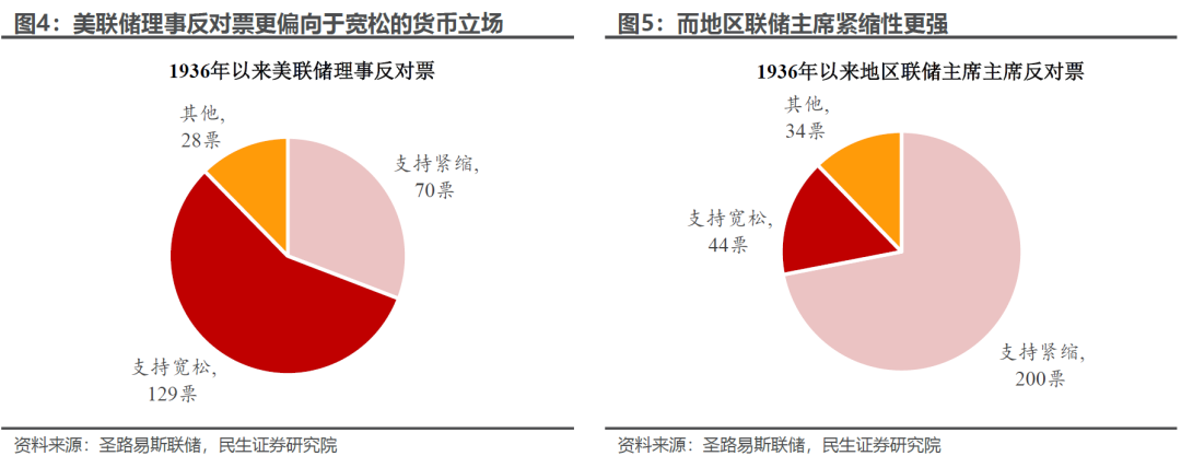 近年来,地区联储主席在FOMC中的话语权持续提升。我们梳理了1936年以来历次美联储议息会议的反对票构成,其中美联储理事共投出227张反对票,而席位相对较少的地区联储主席则投下278张反对票。并且从21世纪以来,反对票几乎全部由地区联储主席投出,在联储的利率决策中的影响愈发不可忽视。
