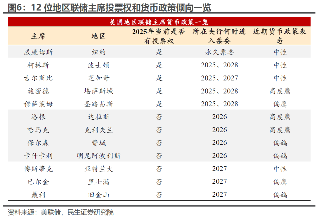 尤其是以洛根(达拉斯联储)、哈马克(克利夫兰联储)、施密德(堪萨斯城联储)等为代表的极端鹰派,几人近期甚至接连表态反对10月降息,施密德一度在10月议息会议上投下反对票。虽然施密德下次进入票委要到2028年,但洛根与哈马克所在的地方联储均为2026年的轮值票委,将参与明年降息决策,若两人寻求连任,大概率会遭到特朗普和理事会的强硬阻拦。