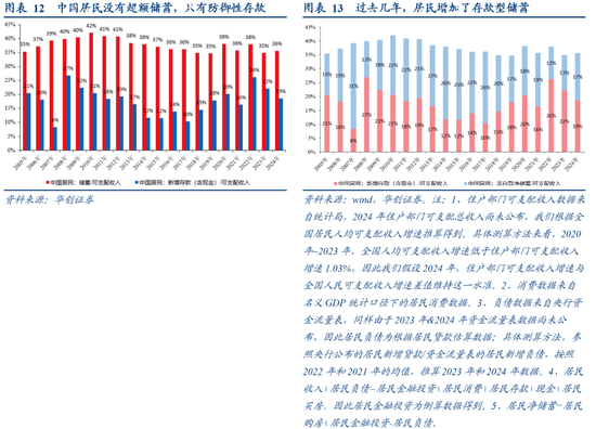 首先,结合前期报告《坐在居民存款的“火山口”》,我们提示本轮居民没有超额储蓄,只有防御性存款。储蓄的定义是可支配收入中减去最终消费的部分,即形成资产即可定义为储蓄。对于居民部门而言,无论是买房,买股票,买基金,还是存款均算作居民的储蓄。2016年~2019年,居民储蓄占收入比重均值约为35%,2022年~2024年,居民储蓄占收入比重均值约为36%,较2016年~2019年基本持平。考虑到当下房价尚未企稳,居民资产负债表修复仍处于初期的宏观环境下,因此居民存款搬家更多是储蓄内部存款转化成其他资产配置的腾挪,而并非储蓄向消费的转化。
