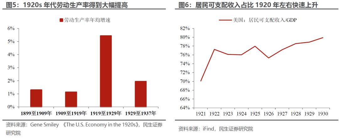 收入的大幅增长是打通生产和消费的重要环节。1920年代美国消费繁荣的背后,居民可支配收入的提升发挥了重要的稳定作用,其占GDP的份额快速上升。