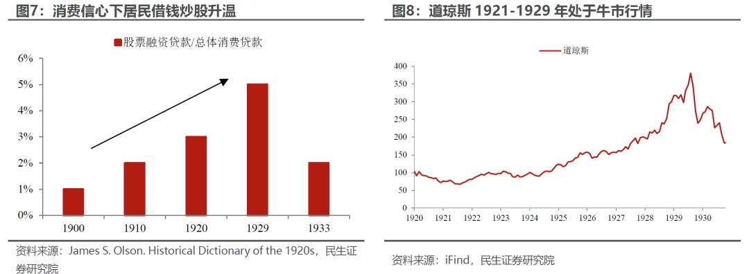 在消费繁荣、信心膨胀的年代,股市很难不牛。从1921年至1929年,美股出现长时期牛市行情,道琼斯指数涨幅接近500%。