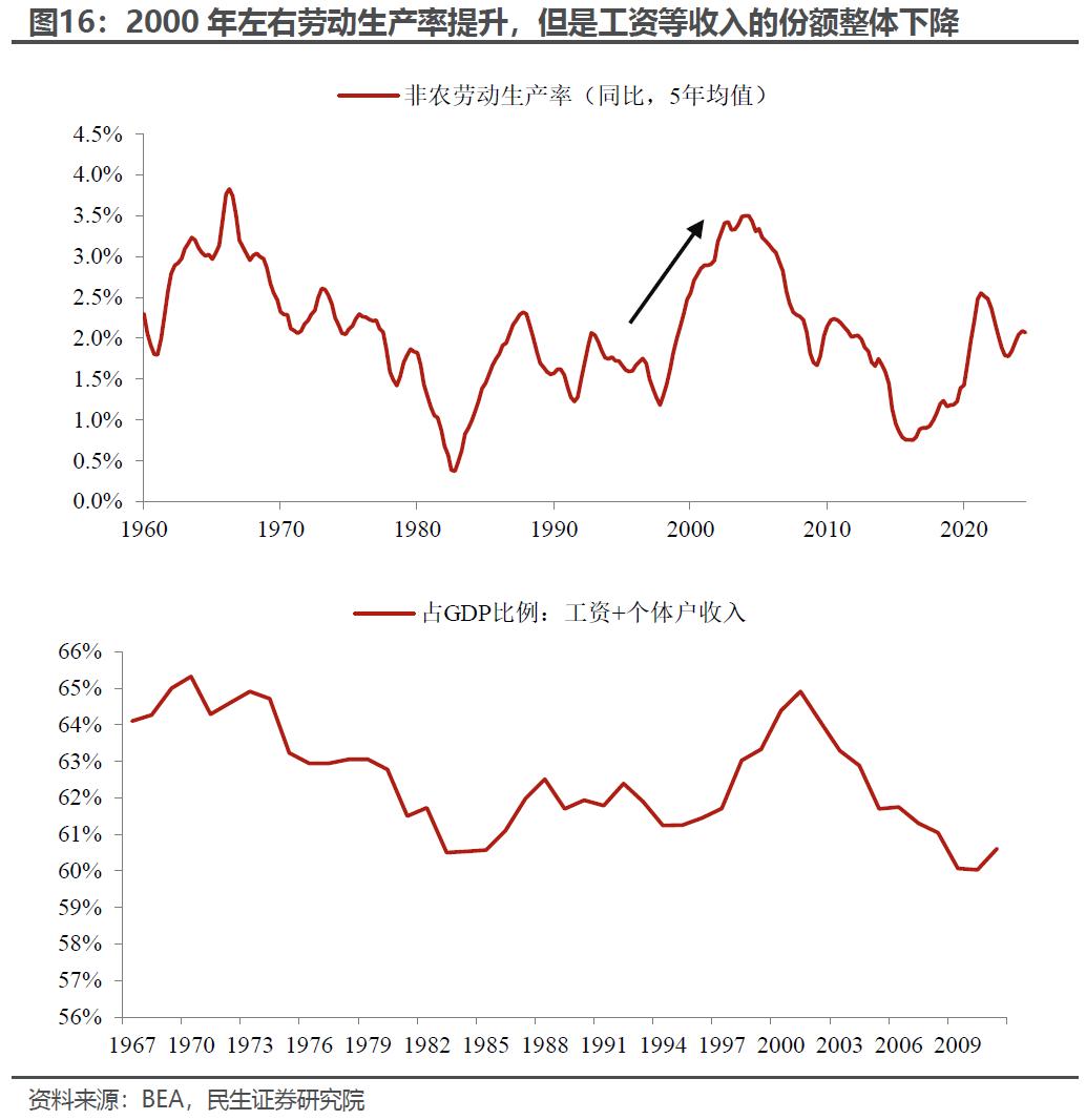居民收入变化的另一种方式。和1920s不同,从1967年至2011年,美国居民的工资相关收入和个体户占比是持续下降的,而在这个阶段,政府补助和资产收益(地产/股债)成为收入的新亮点: